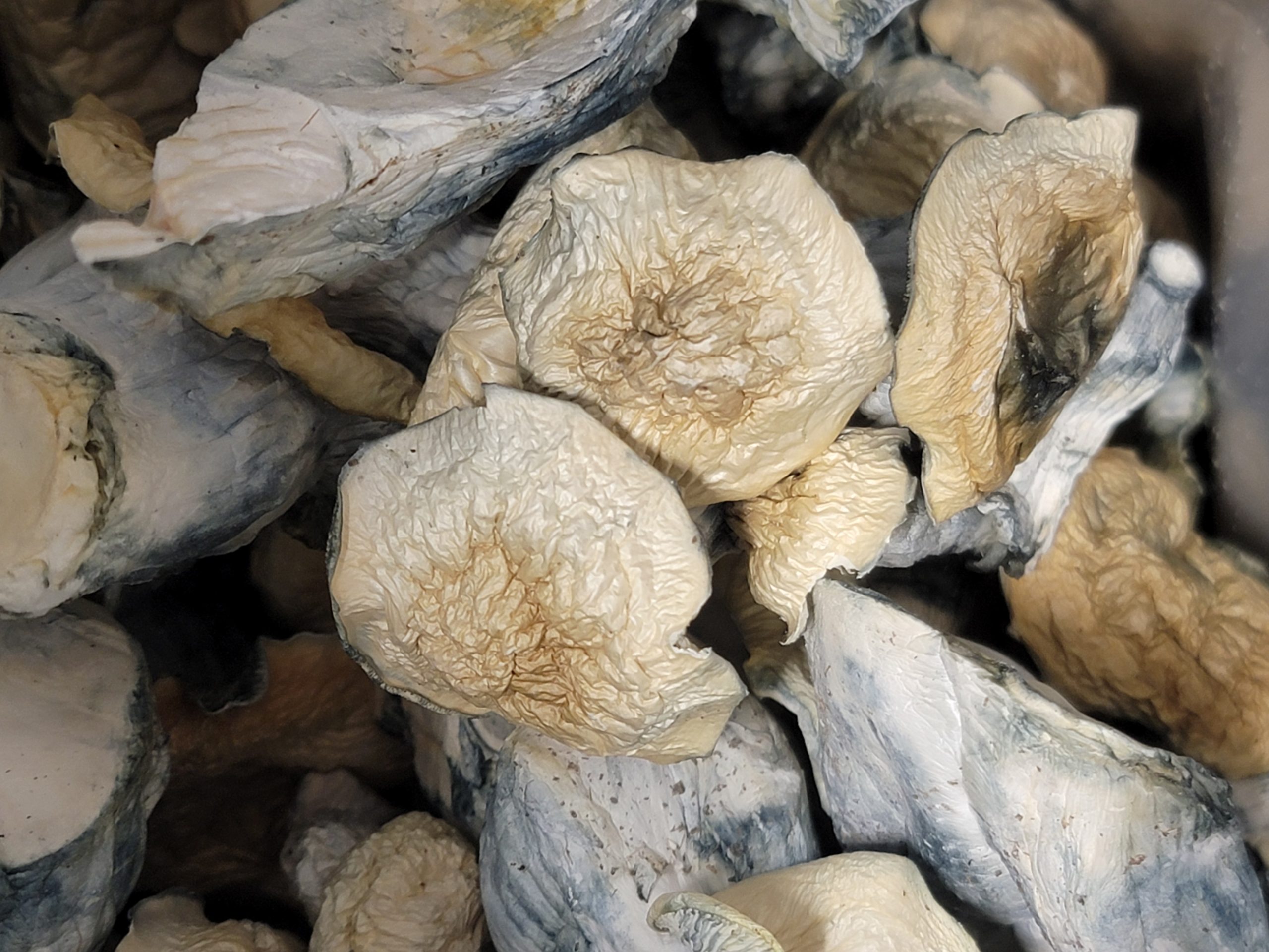 The Albino Bluey Vuitton mushroom is a a premium hybrid strain of Psilocybe cubensis. It is highly regarded in the mycological community for its distinct white-and-blue appearance and potent effects.